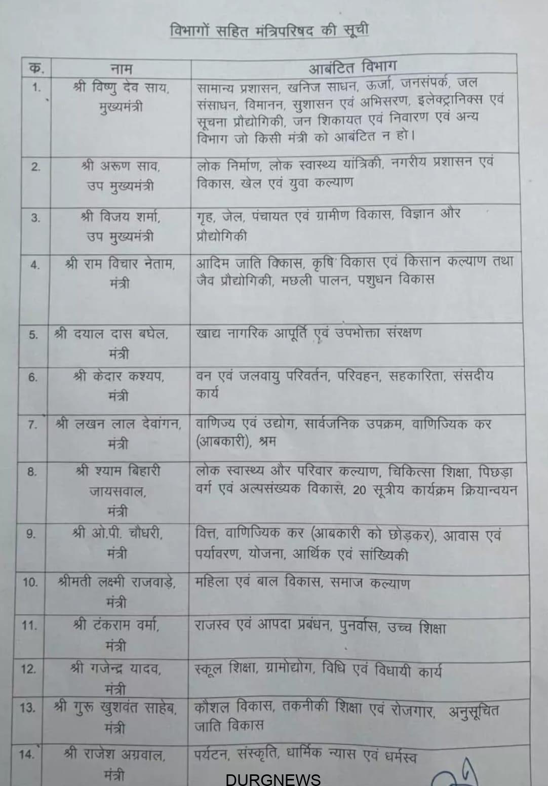 रायपुर। मंत्रियों के बीच विभागों का बंटवारा कर दिया गया है। सीएम साय ने कहा, सुस्पष्ट कार्य विभाजन एवं दायित्व के साथ मेरे कैबिनेट के सहयोगीगण नई ऊर्जा के साथ छत्तीसगढ़ महतारी की सेवा करने तैयार हैं। सभी मंत्रीगण प्रदेश की आकांक्षाओं को मूर्त रूप देने, हमारे संकल्पों की सिद्धि कर प्रधानमंत्री नरेन्द्र मोदी के विकसित भारत के सपने को साकार करने, विकसित छत्तीसगढ़ बनाने में अपना योगदान देने समूची प्रतिबद्धता के साथ तैयार हैं।