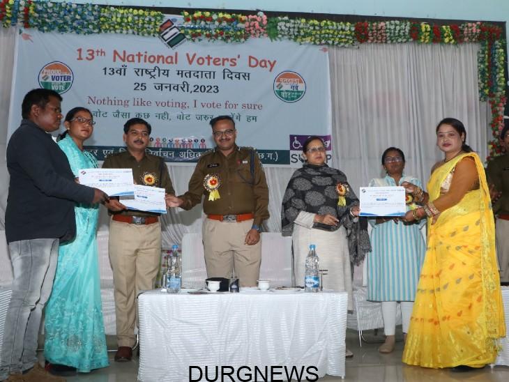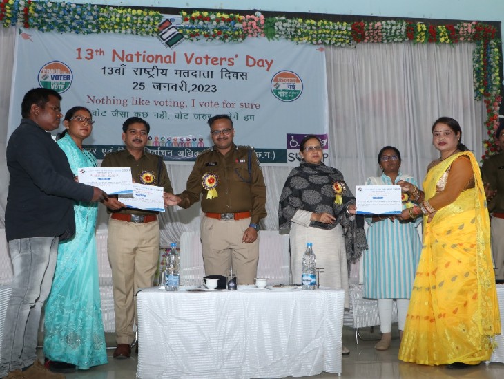 जिला स्तरीय 13वें राष्ट्रीय मतदाता दिवस का आयोजन सूरजपुर नगर के शिव पार्क के समीप स्थित मंगल भवन में आयोजित किया गया। मुख्य अतिथि पुलिस महानिरीक्षक सरगुजा रेंज रामगोपाल गर्ग ने छत्तीसगढ़ महतारी के छायाचित्र पर दीप प्रज्जवलन व राज्यगीत के साथ कार्यक्रम की शुरुआत की। आईजी राम गोपाल गर्ग ने नए मतदाताओं का बैच लगाकर स्वागत व इपिक कार्ड का वितरण किया। उन्होंने तृतीय लिंग के मतदाताओं का शॉल व श्रीफल प्रदाय कर सम्मानित किया।