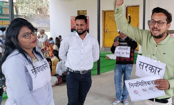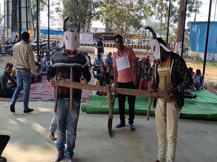 अपनी हड़ताल के पहले दिन कर्मचारियों ने कोल्हू का बैल बनकर विरोध जताया। कुछ कर्मचारियों ने बैल का मास्क लगाया और इन्हें प्रशासनिक अफसर हांकते रहे। कर्मचारियों ने कहा कि तय काम के अलावा भी विभाग में कोल्हू के बैल की तरह इन्हें बहुत सारे काम थोपकर शोषित किया जाता है। इनका मेहनताना बढ़ाया भी नहीं जाता। कई डिपार्टमेंट में इनकी छंटनी की गई है। दंतेवाड़ा में इसी तरह से कर्मचारियों ने छोटे नाटक काे दिखाकर प्रोटेस्ट किया।