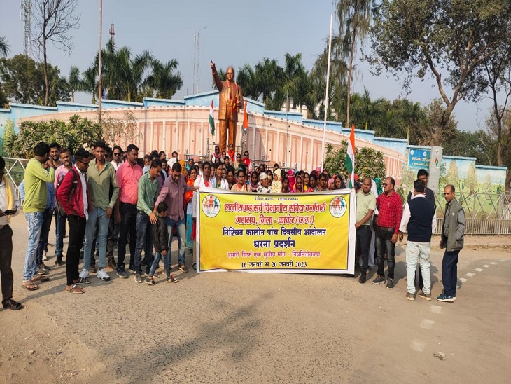 कर्मचारियों ने छत्तीसगढ़ सर्व विभागीय संविदा कर्मचारी महासंघ के बैनर तले सामूहिक हड़ताल की है। इसकी सूचना व ज्ञापन अपने विभाग एवं जिला प्रशासन को कर्मचारियों ने दे दी है। महासंघ के प्रांतीय अध्यक्ष कौशलेष तिवारी ने बताया कि वर्तमान कांग्रेस सरकार बनने के पहले अनियमित कर्मचारियों के मंच में आकर कांग्रेस के नेताओं ने कांग्रेस सरकार बनने पर 10 दिन में संविदा कर्मचारियों को नियमित करने का वादा किया। अब चार साल बाद भी ये मांगे पूरी नही हुई है। इसी वजह से कर्मचारियों को मजबूरन हड़ताल करनी पड़ी है।