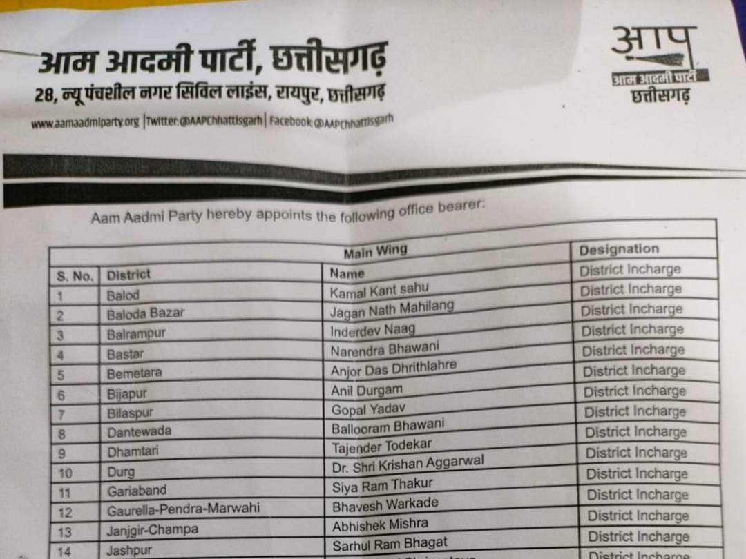 वहीं अगर रायपुर प्रभारी की बात की जाए तो यह जिम्मेदारी नंदन सिंह को दी गई है। उनके अलावा विजय झा को रायपुर का जिला सचिव बनाया गया है। इसी प्रकार दुर्ग में डॉ श्रीकृष्ण अग्रवाल को प्रभारी बनाया गया है। साथ ही संजीत विश्वकर्मा को जिला सचिव बनाया गया है।