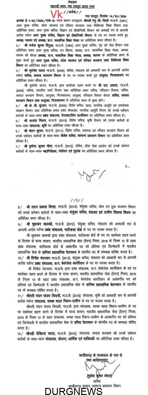 दुर्ग न्यूज़, 15 मार्च। राज्य शासन ने 13 भारतीय प्रशासनिक अधिकारियों की नवीन पदस्थापना का आदेश जारी किया है। ACS मनोज पिंगुआ और IAS रेणु पिल्ले को नई जिम्मेदारी सौंपी गई है। देखें किन्हें मिली कौन सी जिम्मेदारी