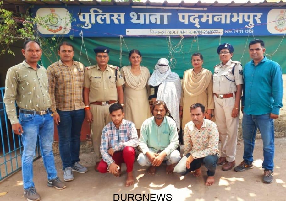 जिले में नशे के अवैध सौदागरों के खिलाफ मुहिम चलाने हेतु पुलिस अधीक्षक जितेन्द्र शुक्ला के निर्देशन में कार्रवाई की गई। पदमनाभपुर पुलिस को 14 अप्रैल को मुखबिर से सूचना मिली कि चंदा ठाकुर निवासी नागपुर महाराष्ट्र के अपने दामाद मनोज राहंगडाले व ड्राइवर यासीन शेख के साथ दुर्ग शहर आकर ग्रीन चौक निवासी प्रेम ठाकुर को ब्राउन शुगर की पुडिया बेच रहे हैं। सूचना पर थाना पद्मनाभपुर स्टाफ मौका स्थल केन्द्रीय जेल दुर्ग केन्टीन के पास रवाना हुआ। मौका स्थान पर पहुँचकर मुखबिर की निशानदेही पर घेराबंदी कर केन्द्रीय जेल दुर्ग, केन्टीन के पास खड़े आरोपियों को पकड़ा गया। पूछताछ में इनका नाम 1. चंदा प्रदीप ठाकुर पति स्व प्रदीप ठाकुर, उम्र-60 वर्ष, पता- इतवारी रेलवे स्टेशन, शाद अस्पताल के पास नागपुर, शांतिनगर (महाराष्ट्र) 2. मनोज राहंगडाले पिता बिसराम राहंगडाले, उम्र 36 वर्ष, पता- इतवारी रेल्वें स्टेशन, शाद अस्पताल के पास नागपुर, शांतिनगर रोड, थाना शांतिनगर, जिला नागपुर, (महाराष्ट्र) 3. यासीन शेख पिता नजीब शेख, उम्र -36 वर्ष, कलमना बस्ती, भवानी आटा चक्की के पास, चित्रशाला नगर थाना कलमना, जिला नागपुर (महाराष्ट्र) 4. प्रेम ठाकुर पिता विजय ठाकुर, उम्र -25 वर्ष, पता स्टेशन रोड ओवर ब्रिज के नीचे, ग्रीन चौक, रेशमा घोड़ी सॉज, थाना मोहननगर, जिला दुर्ग, (छग) का होना बताए। आरोपियों की तलाशी लेने पर इनके कब्जे से अलग-अलग कुल 235 नग नीला व सफेद कागज में लपेटे हुए मादक पदार्थ ब्राउन शुगर की पुड़िया बरामद किया। जिसका अंतराष्ट्रीय बाजार मूल्य 5 लाख तथा बिक्री की नगदी रकम 25 हजार रूपये व चार नग अलग-अलग कम्पनी के मोबाइल, 1 मेहरून कलर की फियेट कार क्रमांक एमएच /49/यू /0994 को जब्त किया गया है। आरोपी से ब्राउन शुगर रखने व लाने के संबंध में पूछताछ करने पर बताया कि करीब एक सप्ताह पहले नागपुर (महाराष्ट्र) रेलवे स्टेशन के पास गली में एक बेनाम व्यक्ति से 150 रूपये प्रति पुड़िया के हिसाब से कुल 235 नग पुडिया ब्राउन शुगर खरीदा था जिसे दुर्ग शहर में लाकर केन्द्रीय जेल दुर्ग केन्टीन के पास 250 रूपये प्रति पुडिया के हिसाब से बेच रहे थे। जिसमें 100 पुडिया बेच दिया था जिसकी बिक्री नगदी रकम 25 हजार रूपये एवं शेष 135 पुडिया ब्राउन शुगर मे से 56 पुड़िया आरोपिया चंदा ठाकुर के कब्जे से, 40 पुड़िया मनोज राहंगडाले के कब्जे से, तथा 39 पुडिया आरोपी यासिन शेख के कब्जे से बरामद किया गया है। आरोपियों को गिरफ्तार कर न्यायिक रिमाण्ड पर भेजा गया।