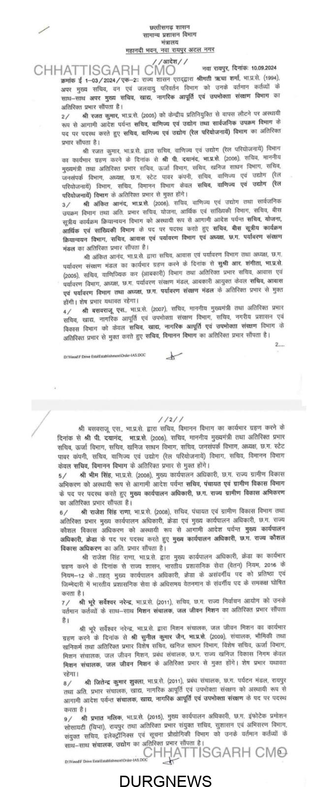 रायपुर। छत्तीसगढ़ में बड़े पैमाने पर आईएएस अफसरों का तबादला किया गया है। सामान्य प्रशासन विभाग की ओर से जारी आदेश के मुताबिक, आईएएस ऋचा शर्मा को वर्तमान कर्तव्यों के साथ नागरिक आपूर्ति एवं उपभोक्ता संरक्षण विभाग के अपर मुख्य सचिव का अतिरिक्त प्रभार दिया गया है। देखें पूरी लिस्ट –
