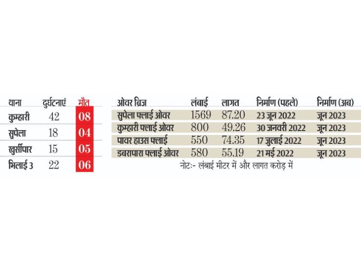 एनएच 53 में कुम्हारी से सुपेला के बीच निर्माणाधीन चारों फ्लाई ओवर मौतों के पिलर पर खड़ा हो रहा है। दैनिक भास्कर ने वर्ष 2019 से 2022 के बीच हुए हादसों की पड़ताल की। इससे पता चला कि ओवर ब्रिज निर्माण के दौरान कुम्हारी से सुपेला के बीच बीते चार वर्षों में 23 लोगों की मौत हो चुकी है। घायलों की संख्या 1 हजार से भी ज्यादा है। लेकिन इनमें महज सौ घायलों ने पुलिस को शिकायत की है। जबकि बाकी घायलों ने मामूली चोट या समझौते की वजह से थाने में शिकायत नहीं की है।