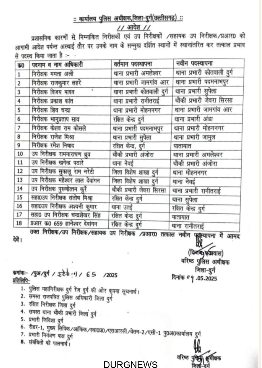 निरीक्षकों में विजय यादव दुर्ग कोतवाली से सुपेला, केशव राम कोसले पद्मनाभपुर से मोहन नगर, भानु प्रताप साव रक्षित केंद्र से अंडा , शिव चंद्र मोहन नगर से जामगांव R के थाना प्रभारी बनाए गए हैं। देखें तबादला सूची –