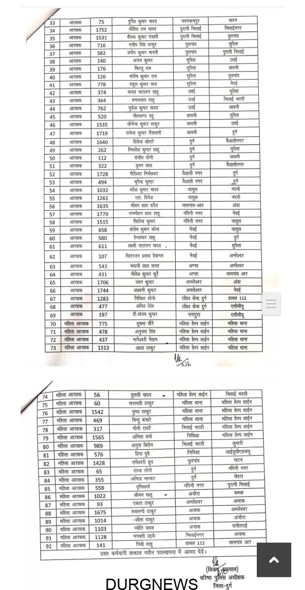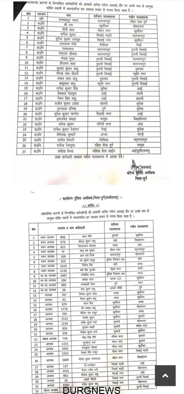 दुर्ग। वरिष्ठ पुलिस अधीक्षक विजय अग्रवाल ने लंबे समय से एक ही जगह पर डटे पुलिस अधिकारियों-कर्मचारियों का तबादला आदेश जारी किया है, प्रशासनिक कारणों से एक उपनिरीक्षक, 26 सहायक उप निरीक्षक, 12 प्रधान आरक्षक एवं 80 आरक्षकों का तबादला आदेश जारी किया है। इनमें 23 महिला आरक्षक भी शामिल हैं। सभी स्थानांतरित लोगों को आदेशित किया गया है कि वे तत्काल नवीन पदस्थापना स्थल पर अपनी आमद दें। देखें जारी सूची