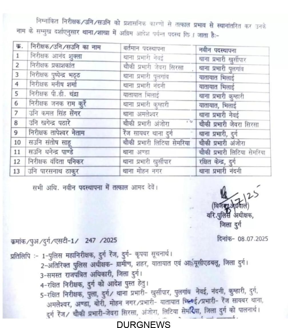 भिलाई नगर। दुर्ग जिले के वरिष्ठ पुलिस अधीक्षक विजय अग्रवाल ने प्रशासनिक दृष्टिकोण से अस्थाई रूप से आगामी आदेश तक नेवई, खुर्सीपार, नंदिनी, कुम्हारी, दुर्ग कोतवाली, अमलेश्वर, पुलगांव, के थाना प्रभारी बदल दिए हैं।