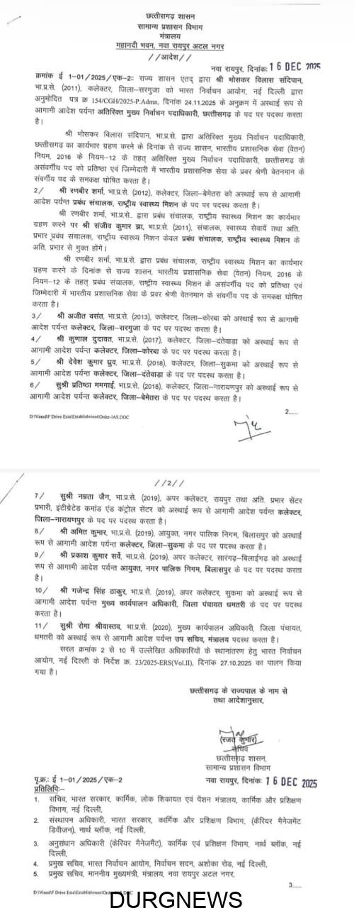 रायपुर। राज्य शासन ने 11 आईएएस अधिकारियों के तबादले किए हैं। कई जिलों के कलेक्टर इधर से उधर किए गए हैं। कोरबा कलेक्टर अजीत वसंत को सरगुजा का कलेक्टर बनाया गया है। वहीं दंतेवाड़ा कलेक्टर की ज़िम्मेदारी संभाल रहे कुणाल दुदावत को कोरबा कलेक्टर की नई जिम्मेदारी सौंपी गई है। सुकमा कलेक्टर देवेश ध्रुव को दंतेवाड़ा और नारायणपुर कलेक्टर रही प्रतिष्ठा ममगाई को बेमेतरा का कलेक्टर बनाया गया है। नम्रता जैन को नारायणपुर कलेक्टर पदस्थ किया गया है।