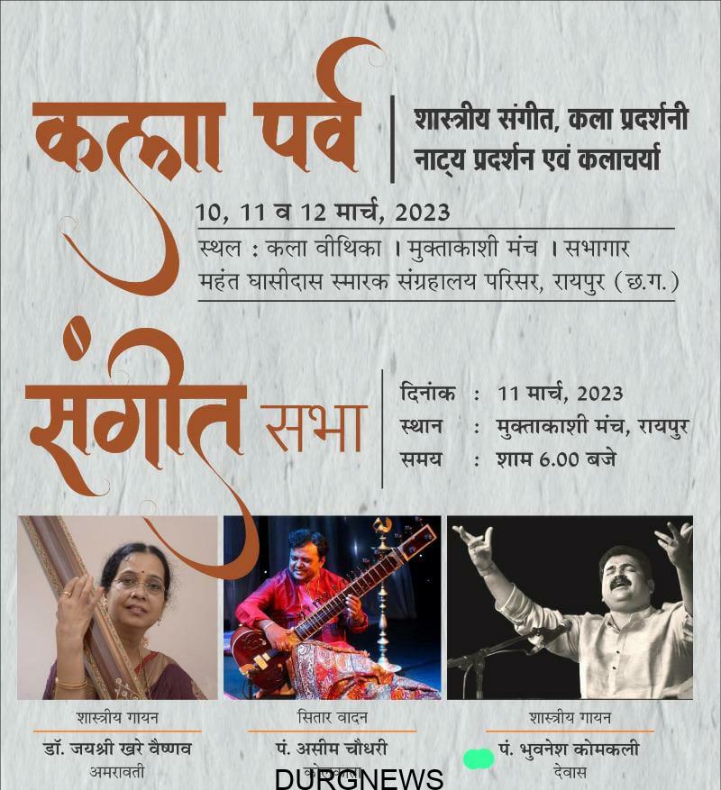 जिसमें रायपुर के किशन देवांगन का शास्त्रीय गायन, भिलाई की पूनम सर्पे का एकल तबला वादन, रायपुर के डॉक्टर के रोहन नायडू का वायलिन वादन और नई दिल्ली के पंडित रितेश एवं पंडित रजनीश मिश्रा का शास्त्रीय गायन होगा। संगत कलाकारों में मिलिंद वैष्णव, पंडित पार्थसारथी मुखर्जी, रामेंद्र सिंह सोलंकी ,रामचंद्र सरपे और श्रीकांत पीसे होंगे। आयोजन के अंतर्गत ‘कलाचर्या‘ का विशेष कार्यक्रम 11 मार्च को शाम 4 से 6 बजे तक रखा गया है। जिसमें आधुनिक कला के पक्ष विषय पर चित्रकार अखिलेश से कला मर्मज्ञ निधीश त्यागी की बातचीत होगी। वहीं अगले दिन 12 मार्च को शाम 4 बजे से 6 बजे तक चित्रकार अखिलेश से डॉक्टर विकास चंद्र एवं कला विद्यार्थियों की बातचीत महंत घासीदास स्मारक संग्रहालय के सभागार में होगी। श्री त्रिपाठी ने बताया कि कला पर्व के अंतर्गत कुछ प्रमुख नाटकों का विशेष मंचन रखा गया है। जिसमें कला वीथिका मुक्ताकाशी मंच सभागार में महंत घसीदास स्मारक संग्रहालय परिसर रायपुर में युवा निर्देशकों की नाट्य प्रस्तुति होगी।