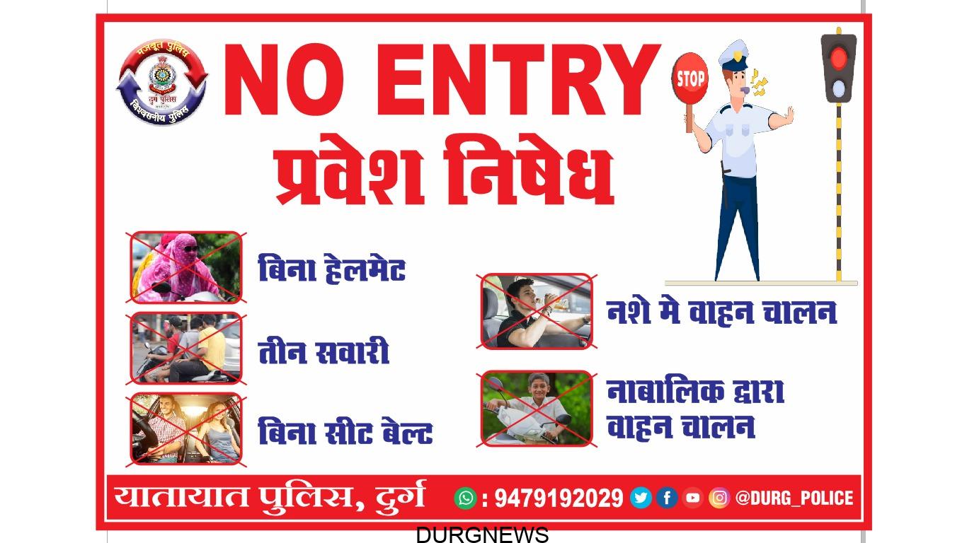 भिलाई नगर, 9 मई।‌ बुधवार 10 मई से दुर्ग पुलिस द्वारा नो इंट्री-बिना हेलमेट बिना सीट बेल्ट, दो पहिया वाहन में तीन सवारी, नाबालिक द्वारा वाहन चालन एवं नशे में वाहन चालकों पर सख्ती करते हुये जिले के प्रमुख 12 प्रवेश स्थान कुम्हारी टोल प्लाजा, अम्लेश्वर थाना के सामने, पाटन तर्रा नाका, जामगांव आर के सामने, मचांदुर चौकी, गाडाडीह नाका, अण्डा थाने के सामने, अंजोरा चौकी के सामने, नगपुरा चौकी, बोरी तिराहा, धमधा पुलिया, नंदिनी बेरला रोड चेकिंग पाईट पर बैनर एवं पाम्पलेट वितरण कर वाहन चालकों को यातायात नियमों का पालन करने हेतु समझाईश देते हुए हेलमेट एवं सीट बेल्ट लगाकर दुर्ग जिले के अंतर्गत प्रवेश दिया जायेगा। इस दौरान यातायात एवं थाने का संयुक्त बल मौजूद रहेगा।एसपी डाक्टर अभिषेक पल्लव ने बताया कि सुरक्षित वाहन चालन के लिए यातायात नियमों का पालन बहुत ज्यादा जरूरी है। इसीलिए दुर्ग जिला पुलिस कल से यह अभियान शुरू कर रही है जिसका समय सभी निश्चित पाइंट पर शाम 6 से 8 बजे होगा।