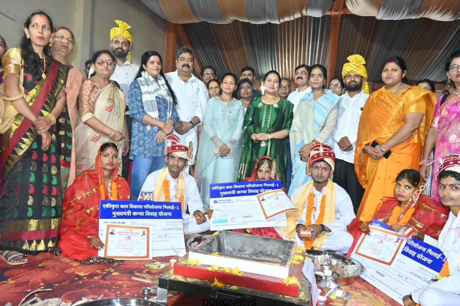 भिलाई नगर,26 जून। नगर निगम भिलाई क्षेत्र अंतर्गत महिला बाल विकास विभाग द्वारा आयोजित मुख्यमंत्री सामूहिक कन्या विवाह योजना के तहत सोमवार को सर्व समाज मांगलिक भवन में विवाह कार्यक्रम हुआ जिसमें मुख्यमंत्री के ओएसडी मनीष बंछोर, महापौर नीरज पाल, मुख्यमंत्री की सुपुत्री डॉक्टर श्वेता बघेल, निगम आयुक्त रोहित व्यास, अंत्यावसायी सहकारी समिति एवं वित्त विकास निगम की उपाध्यक्ष नीता लोधी, सभापति गिरवर बंटी साहू, महापौर परिषद की सदस्य मीरा बंजारे एवं रीता सिंह गेरा आदि ने नए जोड़ों को उनके सुखद जीवन के लिए शुभकामनाएं दी। सर्व समाज मांगलिक भवन में आयोजित मुख्यमंत्री सामूहिक कन्या विवाह के कार्यक्रम में 39 जोड़े आज परिणय सूत्र में बंधे। महापौर नीरज पाल ने मुख्यमंत्री कन्या विवाह योजना को शासन की महत्वकांक्षी योजना बताया। वही निर्धन परिवार की कन्याओं तथा बेसहारा कन्याओं को भी इस विवाह योजना से लाभ मिलता है। इस योजना में खास बात यह है कि विवाह की संपूर्ण सामग्री जैसे वस्त्र, आलमीरा, पेटी, रैक, बर्तन, ड्रम, कुकर, चांदी, मंगलसूत्र, बिछिया और घड़ी सेट एवं 21 हजार रुपए चेक के माध्यम से दिया जाता है। इसकी व्यवस्था मुख्यमंत्री कन्या विवाह के अधीन प्रशासनिक तौर पर होती है। मुख्यमंत्री कन्या विवाह के तहत पूरे विधि, विधान एवं मंत्रोच्चार के साथ विवाह संपन्न कराया गया। पूरे धूमधाम से बारात भी निकाली गई। विवाह समारोह में वर-वधु के परिचित एवं परिजन भी बड़ी संख्या में शामिल हुए।