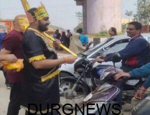 दुर्ग न्यूज, 14 जनवरी। सड़क दुर्घटनाओं में कमी लाने के लिए यातायात पुलिस लोगों को सड़क सुरक्षा के नियम समझाने के लिए नए-नए प्रयोग कर रही है। ऐसे में शहर के एक युवा ने यातायात जागरूकता का संदेश देने के लिए अनोखा तरीका अपनाया। वह यमराज बनकर नेगरू नगर चौक पहुंचा और जो लोग भी बिना हेलमेट या सीट बेल्ट लगाए दिखे उनके ऊपर फूलों की वर्षा करने लगा। हेलमेट और सीट बेल्ट लगाने वाले लोगों को चॉकलेट दी गई।