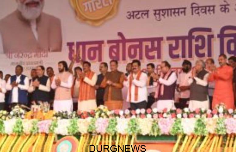 दुर्ग न्यूज़, 26 दिसंबर। मुख्यमंत्री विष्णुदेव साय ने आज पूर्व प्रधानमंत्री अटल बिहारी बाजपेई की जयंती एवं सुशासन दिवस पर छत्तीसगढ़ राज्य के 11 लाख 76 हजार 815 किसानों को 3 हजार 7 सौ 16 करोड़ रुपए के बकाया बोनस राशि का वितरण किया।
